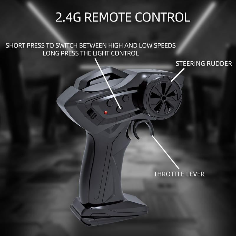 2.4G távirányító: A mellékelt 2,4 GHz-es távirányító gázkarral rendelkezik a gyorsításhoz, egy LED-es lámpákhoz való vezérlőgombbal, valamint kormányvezérlőkkel az autó teljes irányításához.